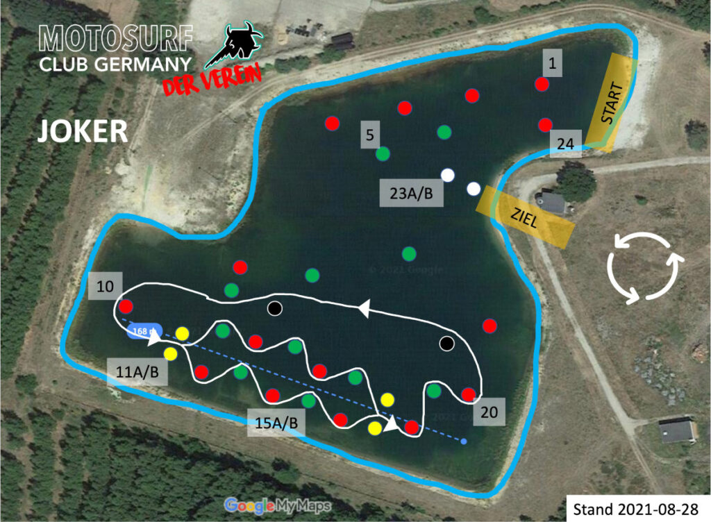 Das bedeutet, dass der Fahrer während des Rennens zu einem von ihm frei wählbaren Zeitpunkt in die Joker Lap abbiegen kann. Er MUSS einmal in der gesamten Renndistanz die Joker Lap durchfahren. Bei unserem Track bedeutet dies, dass nach Verlassen des Split und Durchfahren der Jokerbojen erneut der Split gefahren wird. Die Runde wird erst nach Durchfahrt zwischen den Zielbojen gezeitet.